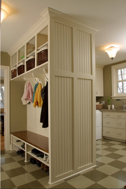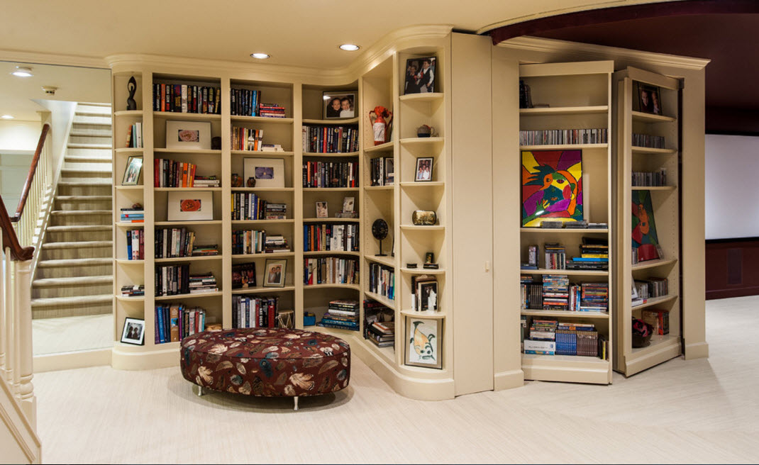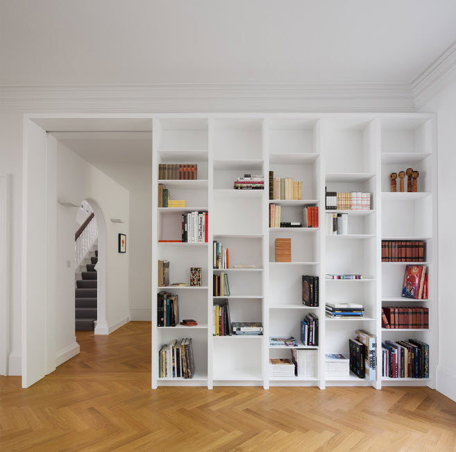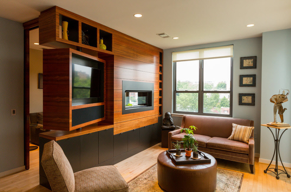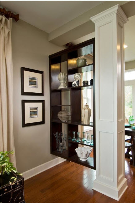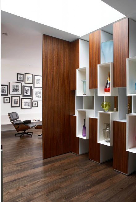 Стеллаж–перегородка с поворотными полками и секциями – сложная с точки зрения сооружения, но практичная конструкция. Вы можете использовать монолитную, на первый взгляд, конструкцию одинаково эффективно с обеих сторон — в двух функциональных зонах. Например, расположенный внутри стеллажа телевизор можно будет смотреть из спальни и гостиной.