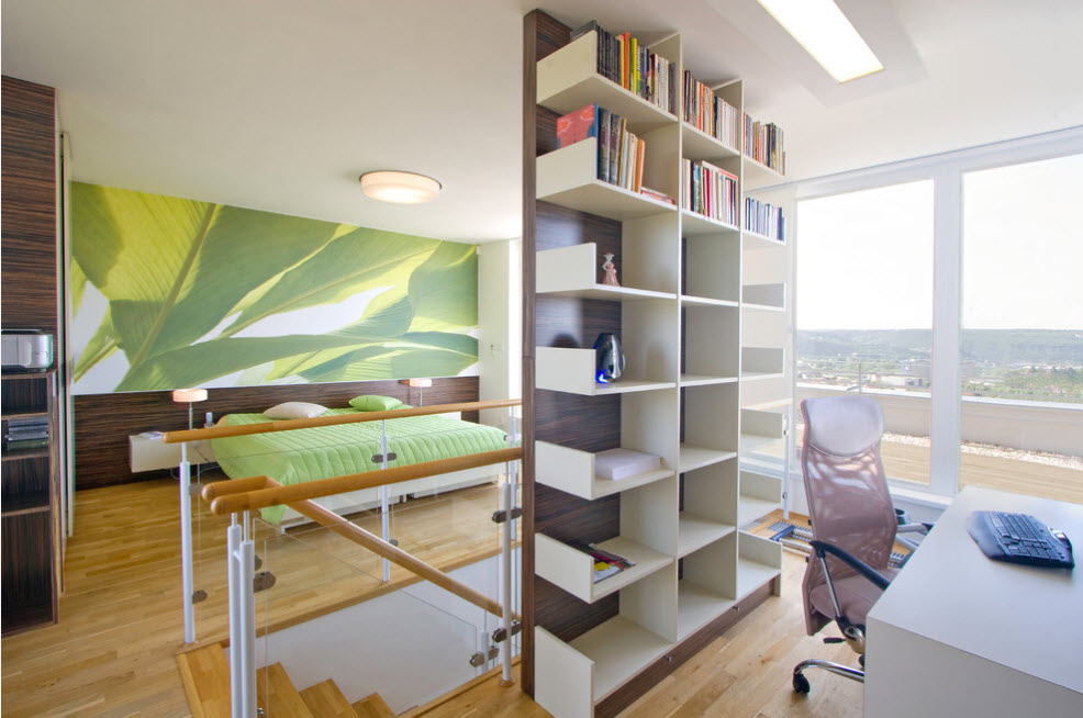 Если вам нужно выделить в небольшом помещении с одним окном функциональный сегмент, то использование «полупрозрачной» конструкции стеллажа – оптимальный вариант для зонирования. К сожалению, многие наши соотечественники вынуждены в малогабаритных пространствах находить возможность выделения отдельных зон. Например, в однокомнатной квартире часто необходимо отделить зону отдыха родителей и сегмент для сна и игр ребенка.