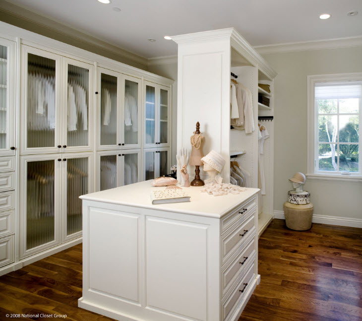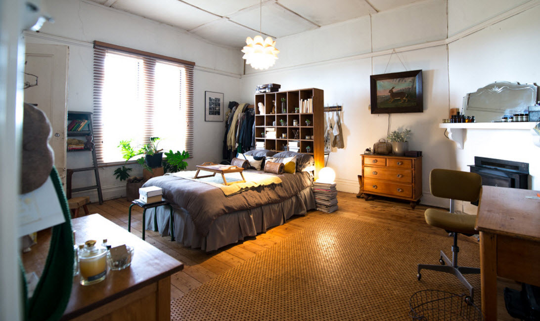 В спальне стеллаж можно использовать в качестве перегородки, отделяющей зоны гардеробной. Очевидно, что полки такой системы хранения будут занимать предметы гардероба хозяев. Стеллаж можно сделать прозрачным или использовать стенку, но со стороны спальной зоны – можно повесить картину или телевизор.