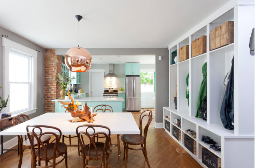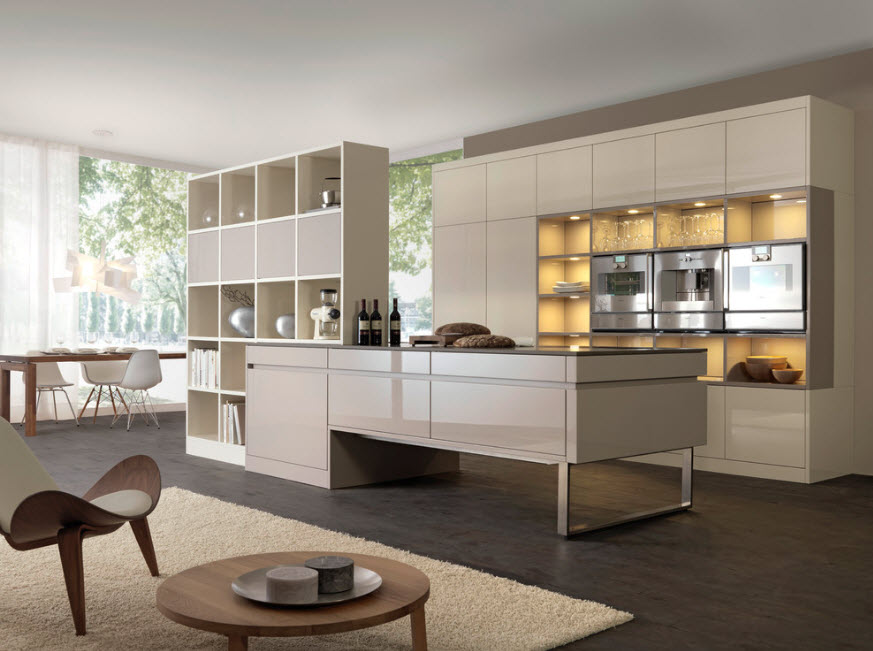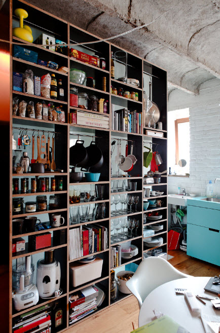 Если в квартире-студии рабочую и обеденную зону кухни-столовой отделяет от пространства гостиной стеллаж-перегородка, то в нем одинаково эффективно будет хранение предметов, которые могут понадобиться во всех перечисленных функциональных сегментах. Это может быть красивая посуда, книги по кулинарии, бытовые приборы или просто декоративные предметы, гармонично вписывающиеся в созданную обстановку.