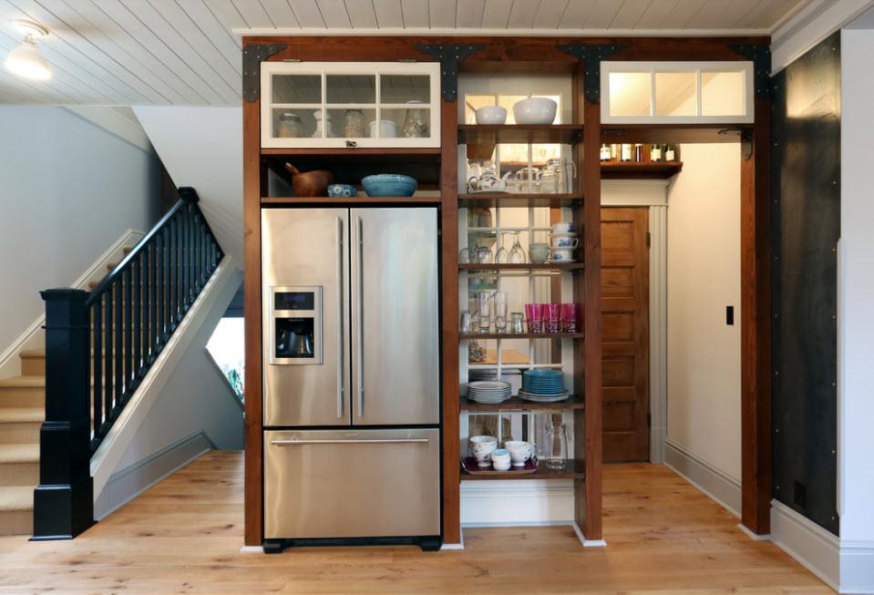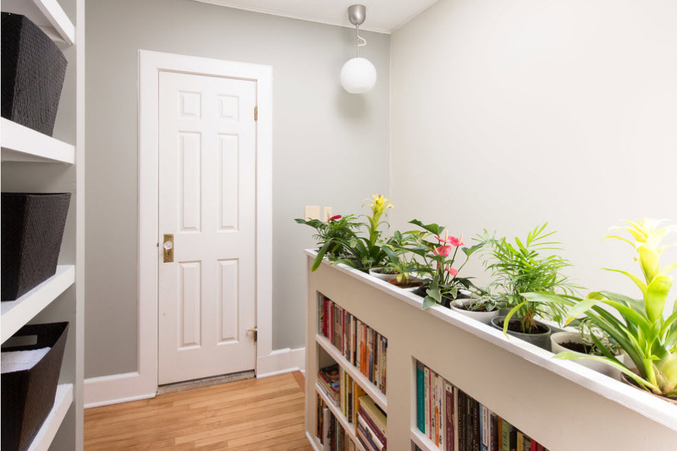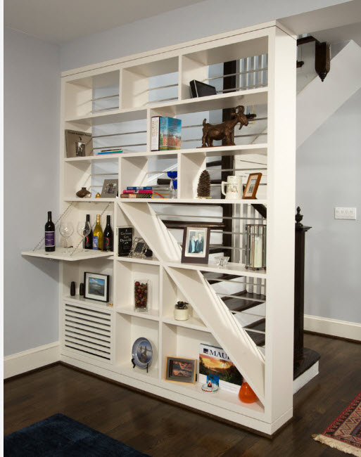 Помимо очевидных опций, среди которых использование стеллажа в качестве системы хранения и предмета зонирования, данный вид перегородки может выполнять и защитную функцию. Например, располагаясь возле лестницы, стеллаж-перегородка не только зонирует пространство, но и выступает в качестве перил, т.е. защитного экрана для тех, кто поднимается или спускается по ступеням. Аналогичную функцию выполняет стеллаж, расположенный на верхнем уровне помещения с несколькими функциональными ярусами.