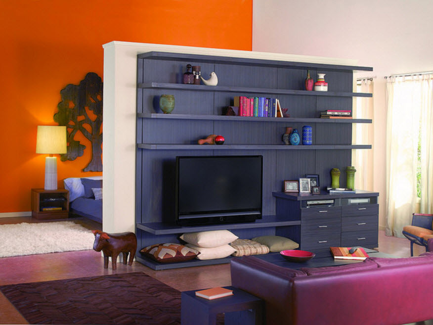 Еще большей популярностью пользуется тандем стеллажа-перегородки и видео-зоны. Современные телевизоры достаточно тонкие и весят не так много – достаточно устойчивого стеллажа с задней стенкой для совмещения систем хранения с обустройством места для просмотра фильмов и передач в гостиной или спальне.