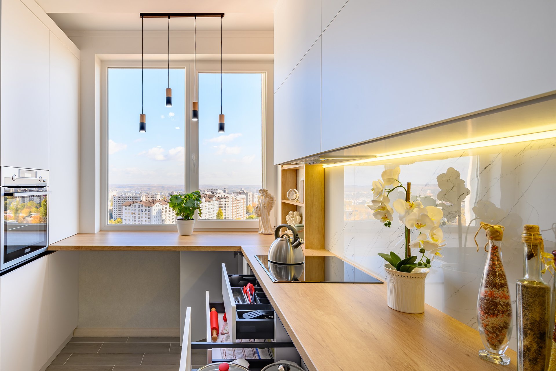 Декору в такой кухне отводится скромная роль. Аксессуаров должно быть немного, чтобы они не занимали драгоценное место и не нарушали лаконичность интерьера. Достаточно одного-двух предметов, например, стильных часов на стене или лаконичного светильника над столом. Важно, чтобы они имели простые, четкие формы и сдержанный дизайн. Таким образом, минимализм доказывает, что даже на небольшой площади можно создать умный, вместительный и невероятно практичный дизайн, который по достоинству оценят ценители порядка и функциональности.