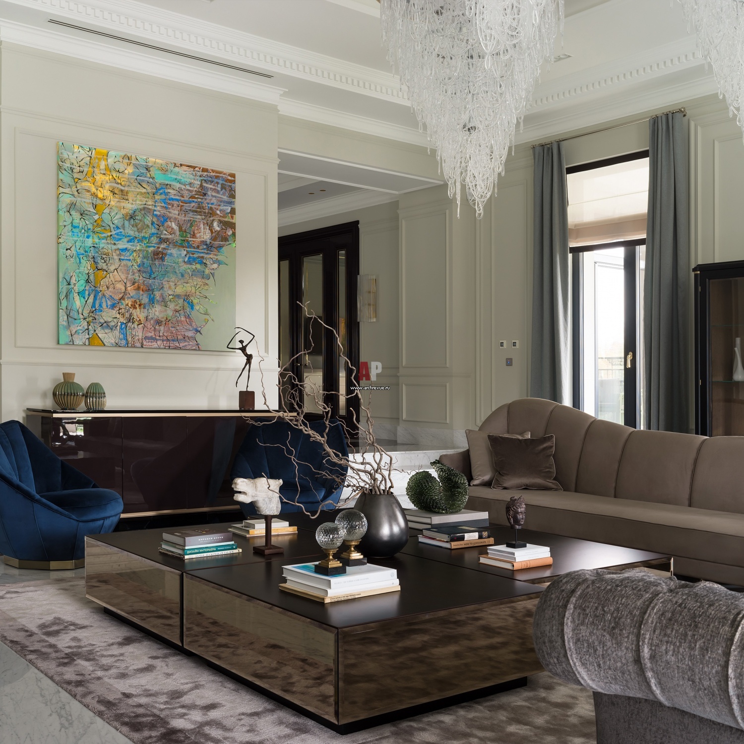 Открытая планировка позволяет играть со светом, создавая многоуровневые сценарии освещения: от центральной люстры до точечных светильников и бра. Мягкие диваны и кресла из добротной ткани заполняют зону отдыха, создавая комфортную и гостеприимную атмосферу.