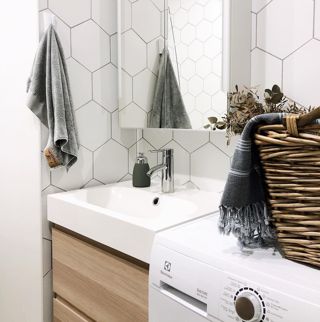 Скандинавский дизайн — это гимн разумному использованию площади. Мебели должно быть минимум, и каждая деталь обязана нести практическую пользу. Это особенно актуально для типовых ванных комнат скромных размеров.