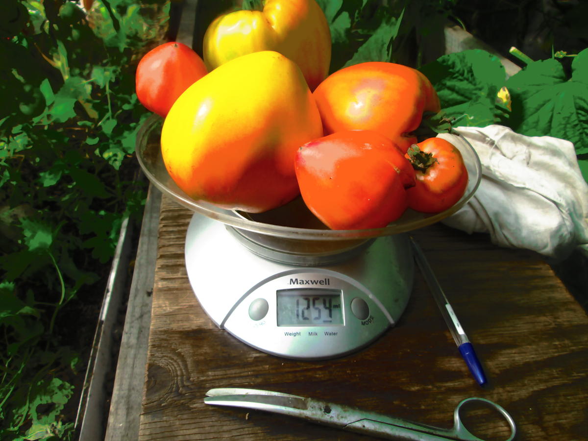 Плоды наливаются медленно, как и у большинства крупноплодных томатов. В незрелом состоянии они светло-зеленые, а при полном созревании приобретают насыщенный оранжевый цвет с эффектными желто-красными полосками. Форма плодов округло-сердцевидная, часто с вытянутым «носиком». Ребристость умеренная, зеленого пятна у плодоножки нет. Несмотря на долгое созревание, гибрид радует высокой урожайностью (до 18 кг с 1 кв. м) и продолжительным периодом плодоношения.