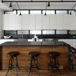 В просторной кухне, особенно это касается совмещенных помещений, в которых кухонная зона соседствует с гостиной, диван можно использовать и как зонирующий элемент, расположив этот предмет мебели в центре комнаты. Часто такое расположение совпадает с установкой кухонного острова, и задняя часть дивана совмещается с фасадом этого обособленного модуля.