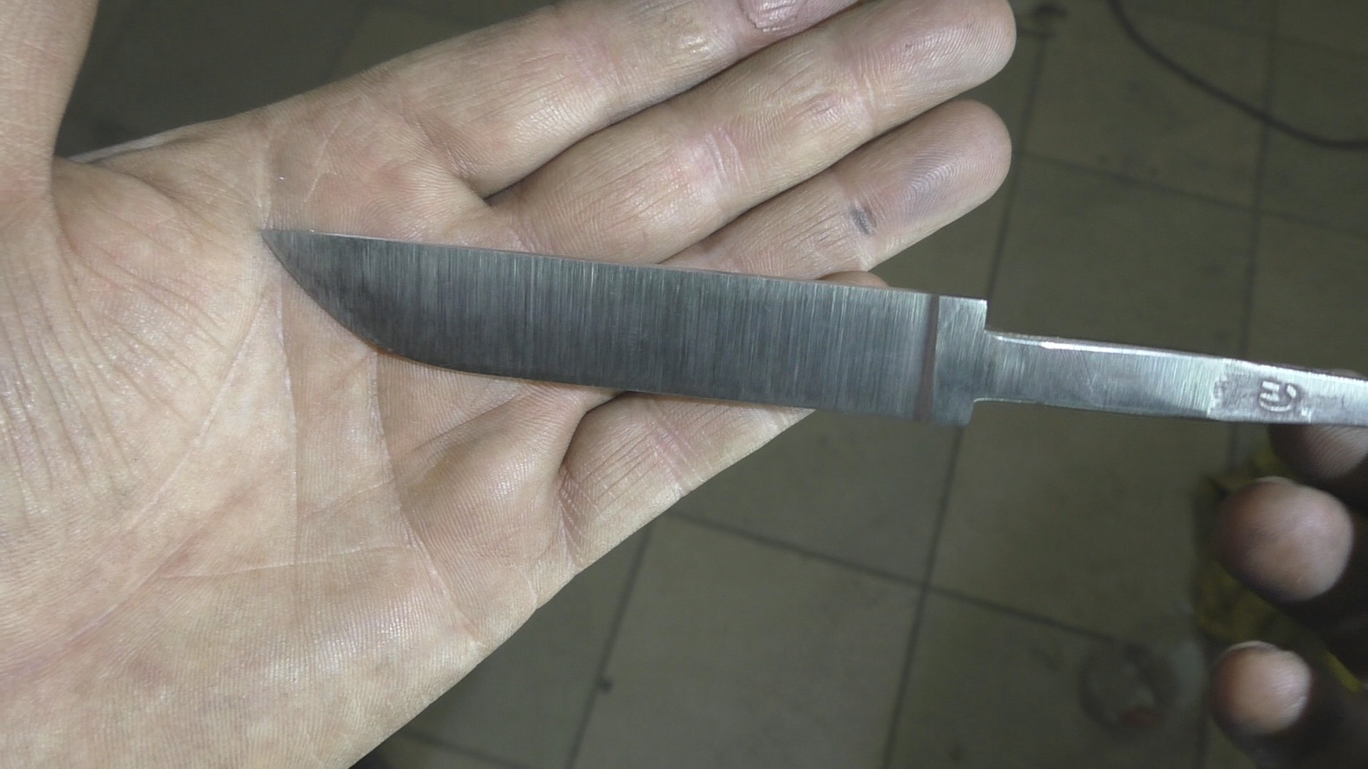 После обжига заготовка становится податливой. Её фиксируют в тисках и с помощью ножовки по металлу или на точильном станке удаляют лишние части, формируя профиль будущего клинка. Также на этом этапе сверлятся отверстия под заклёпки для рукояти.