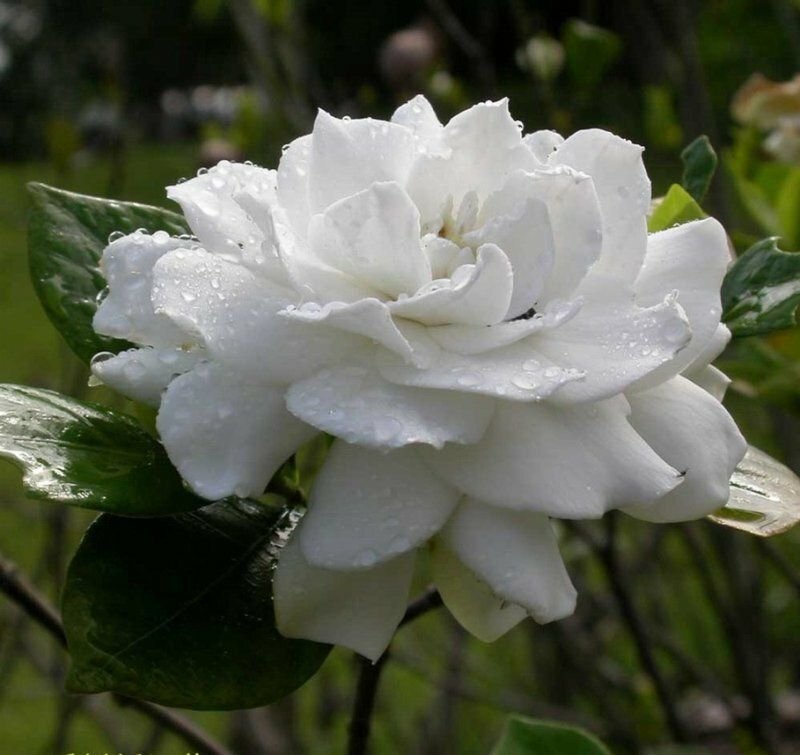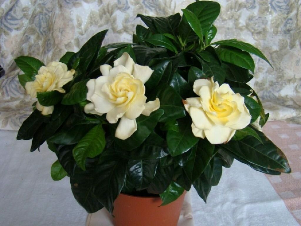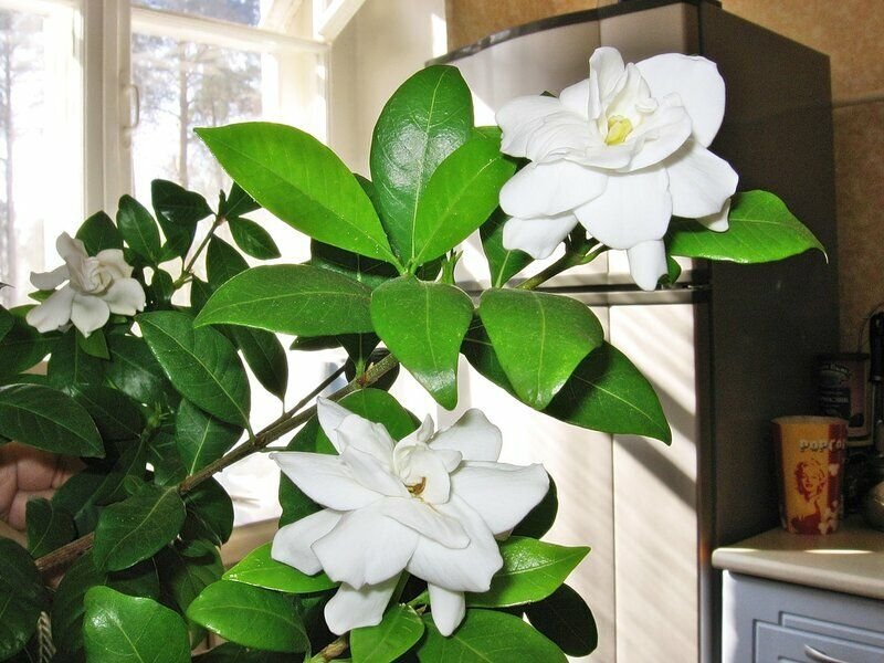 Это жасминоподобная гардения с глянцевыми листьями, на которых видны прожилки. Цветки крупные, белого или желтого цвета, от него исходит очень резкий аромат.