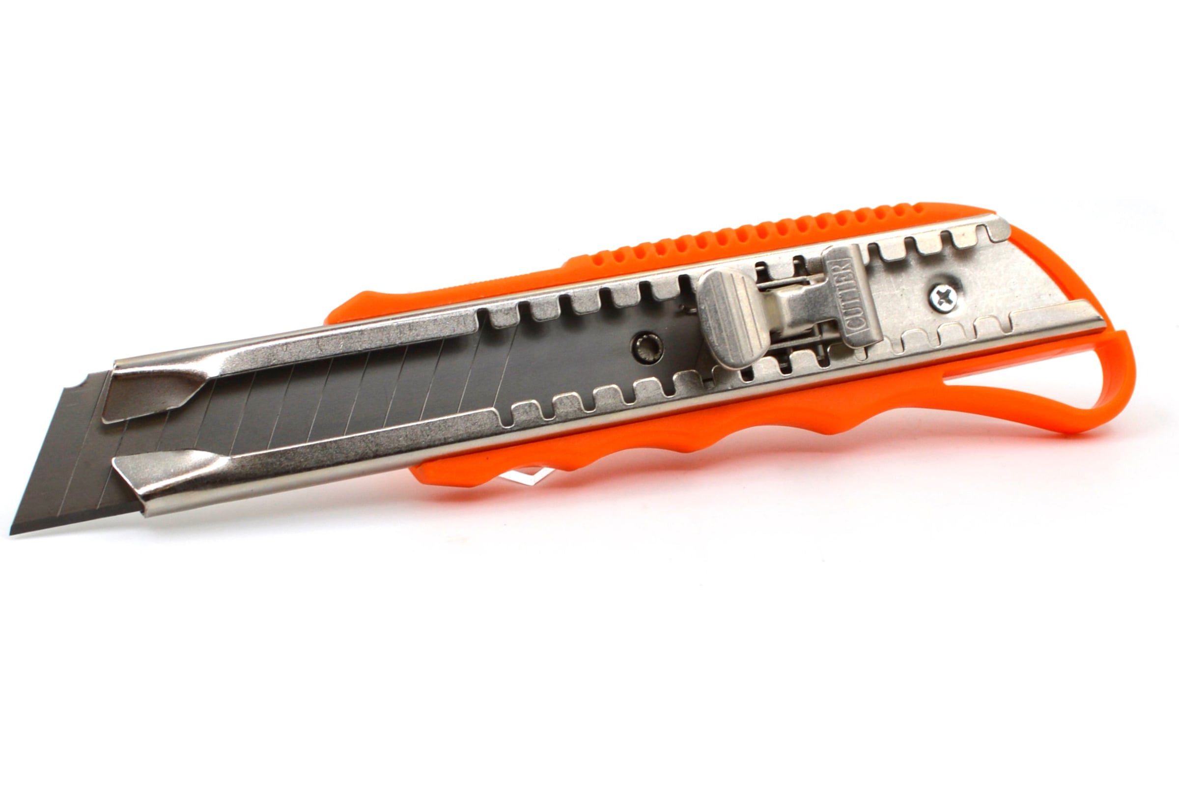 Этот вид ножей является наиболее распространенным и широко применяемым в строительстве. Рабочая часть состоит из тонкой металлической пластины, закрепленной в пластиковом, резиновом или металлическом корпусе с помощью реечных направляющих и зажимного замка. Такой нож по принципу действия и внешнему виду очень похож на обычный канцелярский нож для резки бумаги. Разница лишь в том, что сегментный нож для технических работ имеет металлическую направляющую для крепления и перемещения лезвия, которая предохраняет корпус ножа от поломки при работе с плотными толстыми материалами.