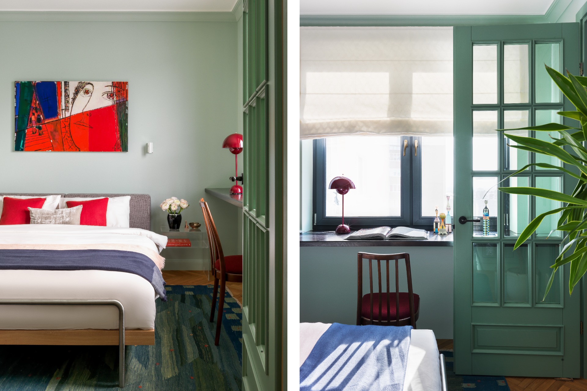 - Зеленый + красный. Смелое и энергичное сочетание, напоминающее корзину с ягодами. Отлично подойдет для столовой или кухни. Лидирующим может быть любой из цветов, либо оба могут использоваться как яркие акценты на нейтральном фоне. Главное — тщательно соблюдать пропорции, чтобы интерьер не стал аляповатым.